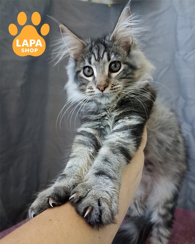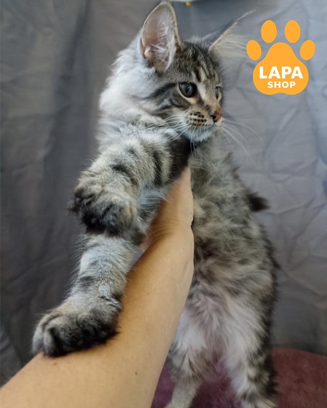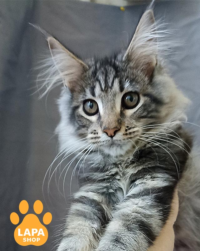 Yara – грациозная девочка породы мейн-кун с густой, блестящей шубкой серебристого мраморного окраса.