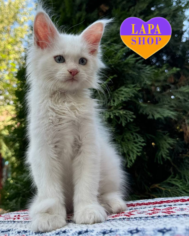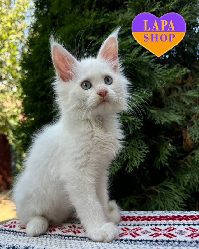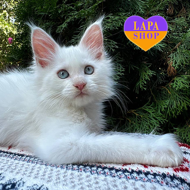 Жасмин – очаровательная девочка мейн-кун с белым окрасом и глубокими голубыми глазами, излучающими нежность и загадочность.