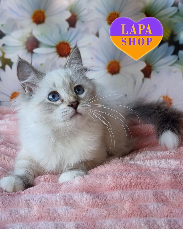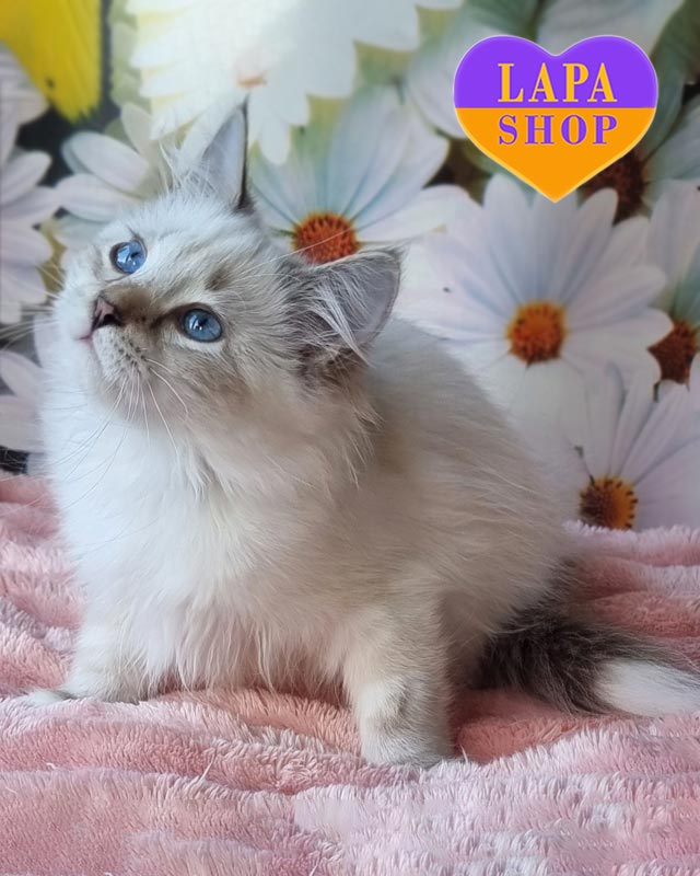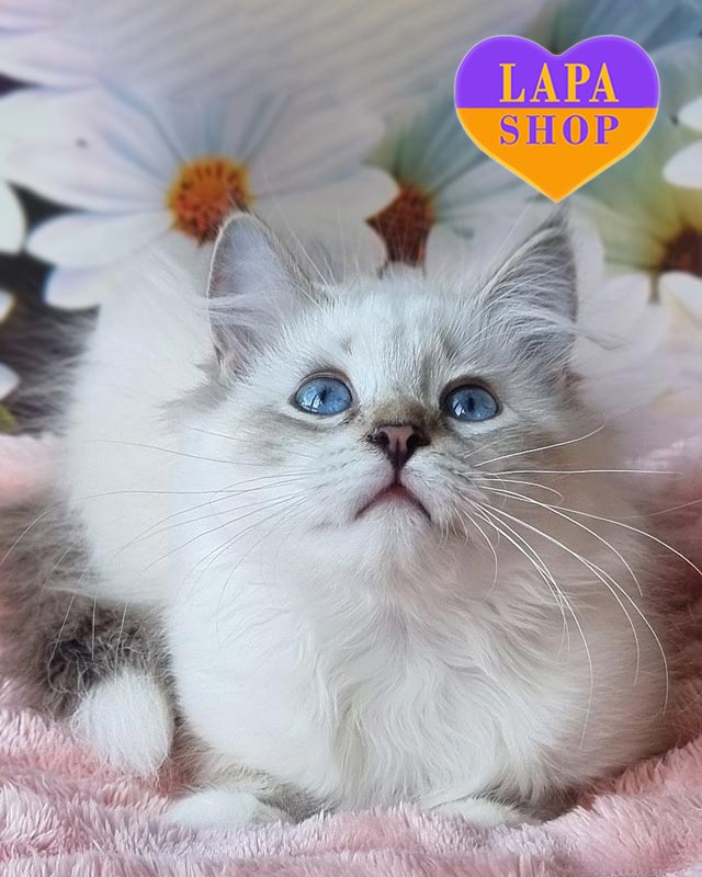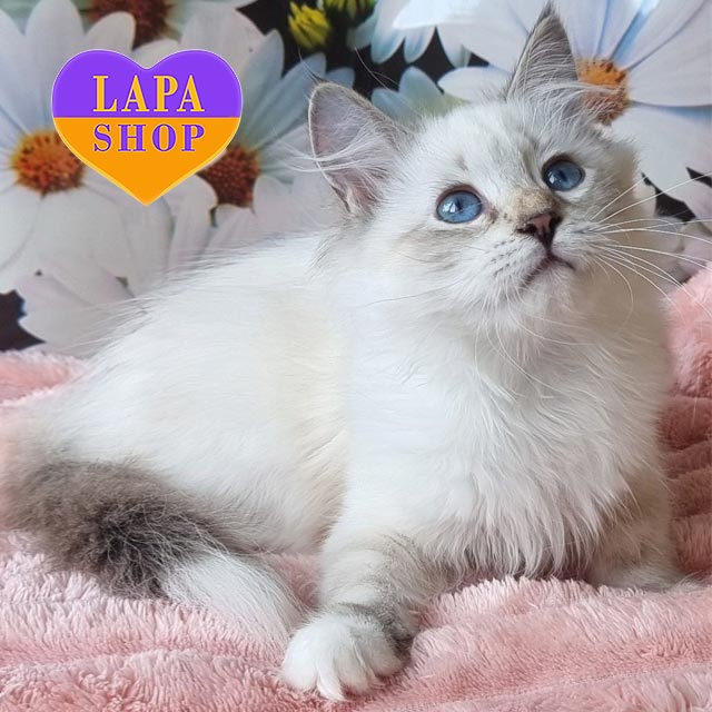 Она имеет нежный окрас сил линкс поинт с белым и голубые глаза, которые покоряют с первого взгляда.