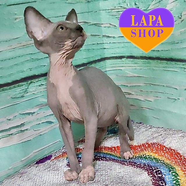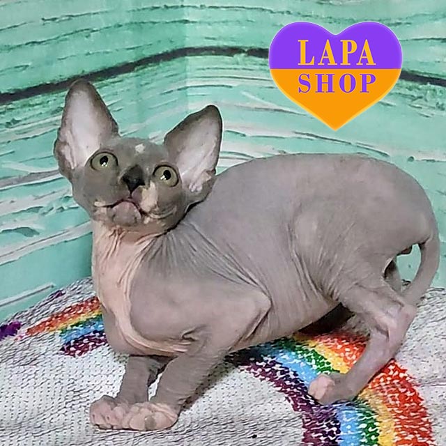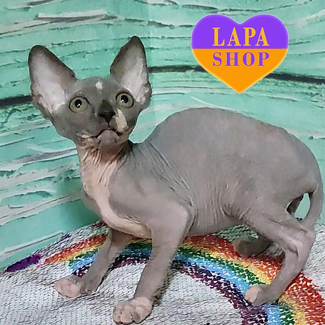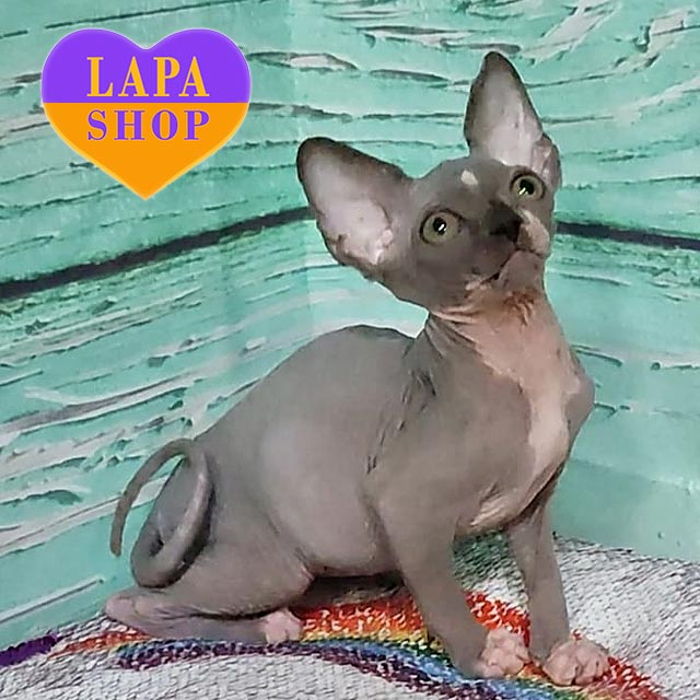 Jingo – милый мальчик породы канадский сфинкс с окрасом голубой биколор.