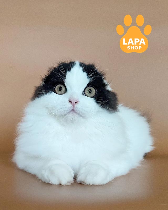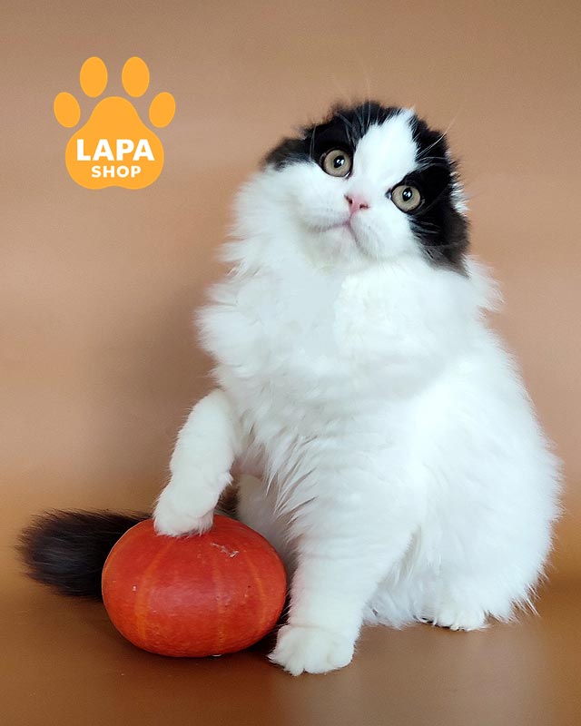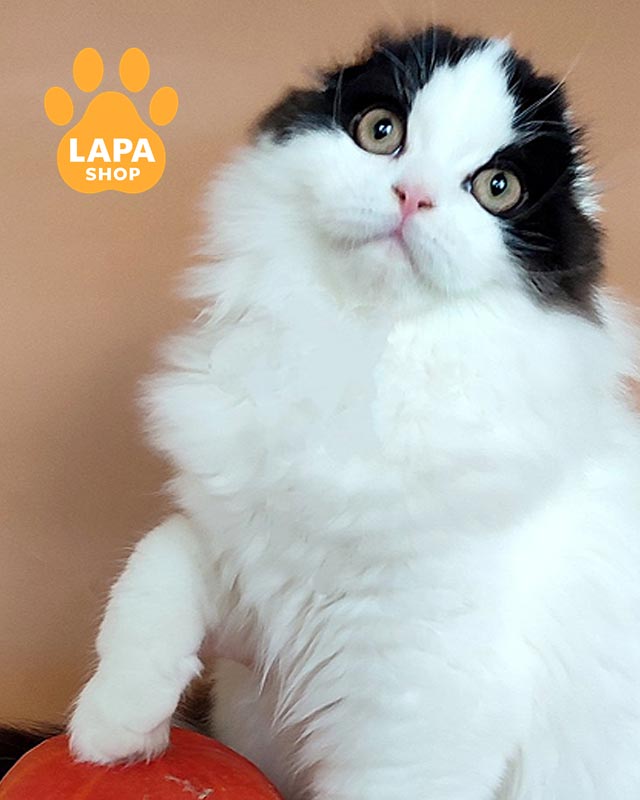 Orlean – грациозный мальчик породы хайленд-фолд в редком окрасе черный ван. Его белоснежная шерсть украшена выразительными черными отметинами, а складные ушки придают образу неповторимого обаяния.