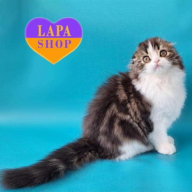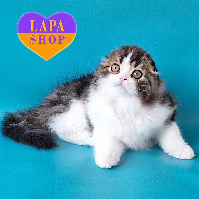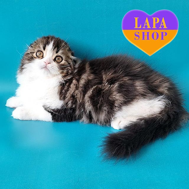 Vinnie Pooh – милый хайленд-фолд с роскошной длинной шерстью черной мраморного окраса с белым. Его милые вислоухие ушки и выразительные глаза придают ему особеный шарм.