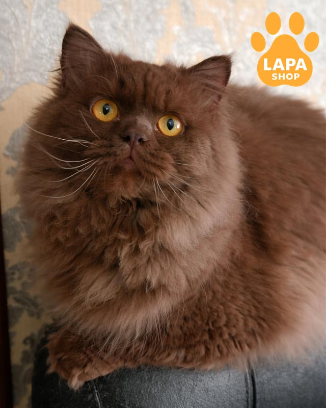 Joker – яркий мальчик породы хайленд-страйт с насыщенным шоколадным окрасом (b) и роскошной длинной шерстью, которая делает его особенно выразительным и привлекательным.