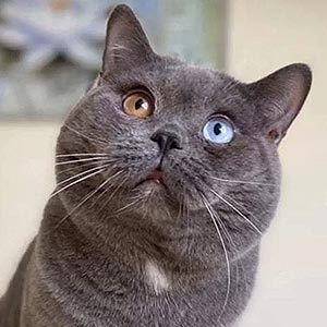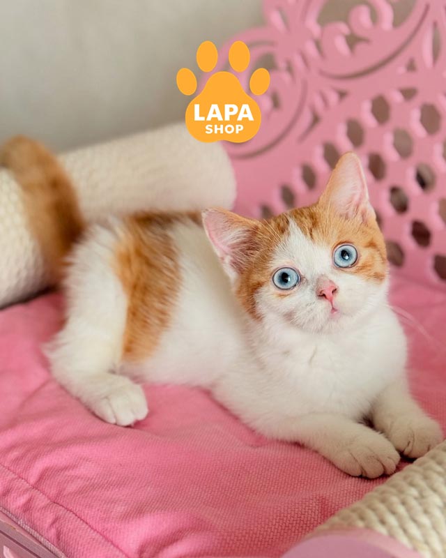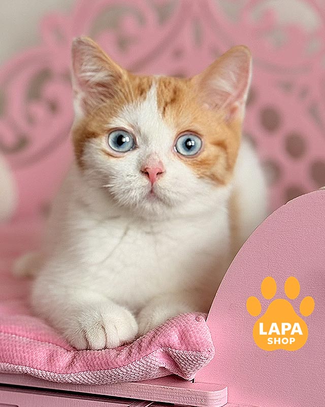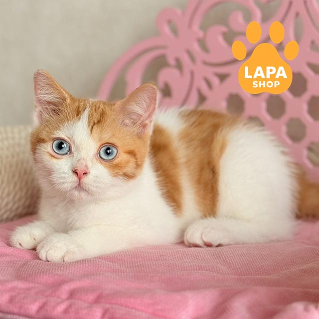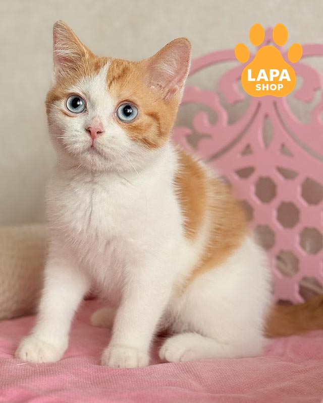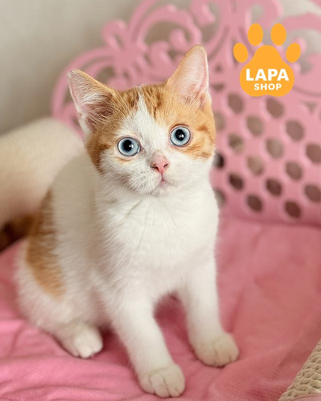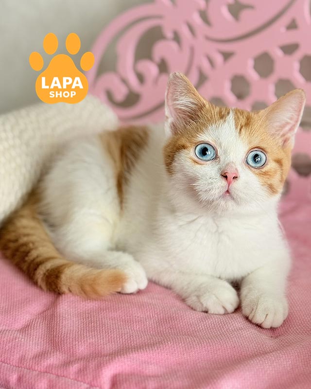 Casper – удивительный скоттиш-страйт с роскошным красно-белым арлекиновым окрасом и невероятно красивыми голубыми глазами.