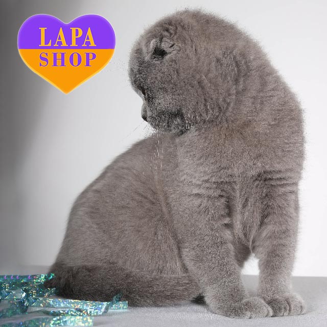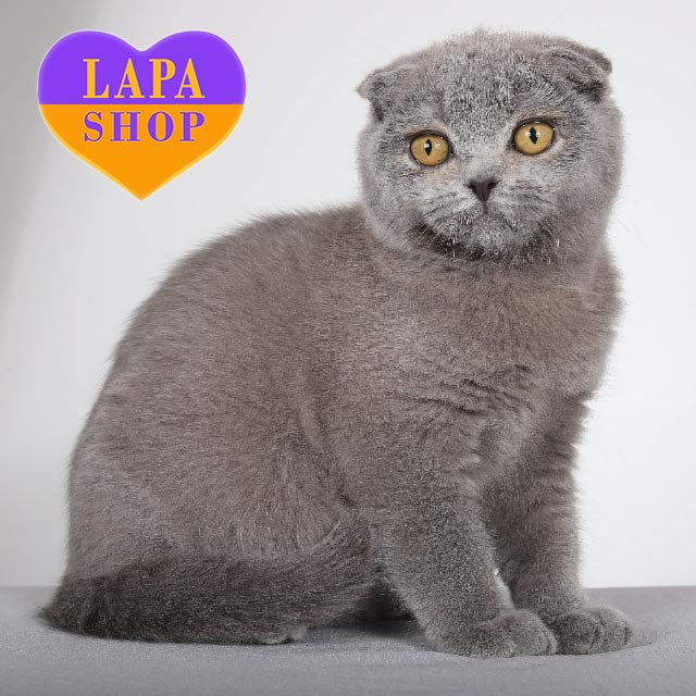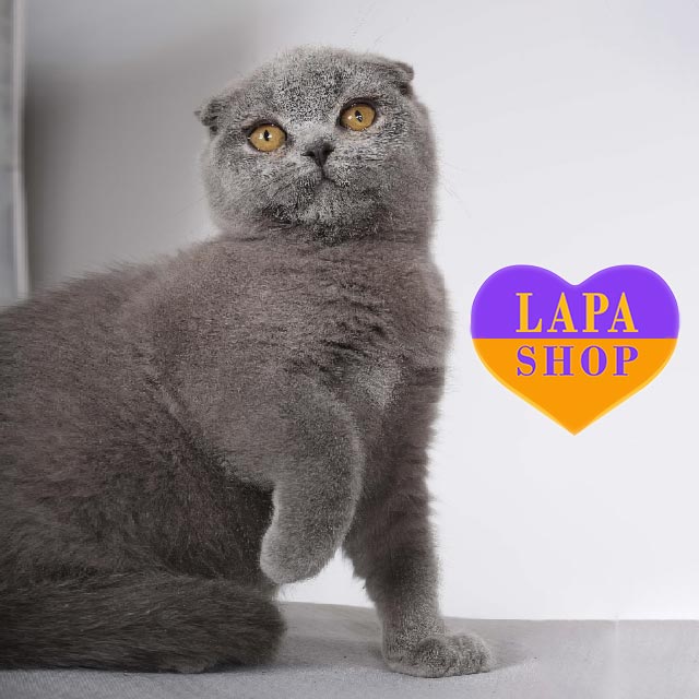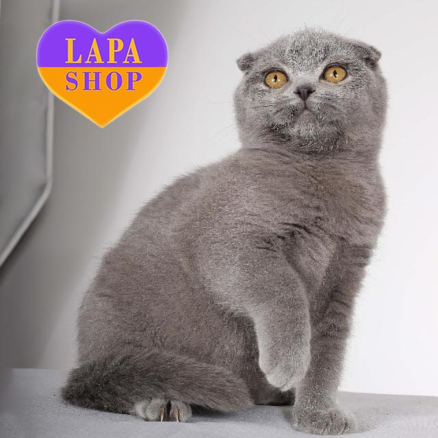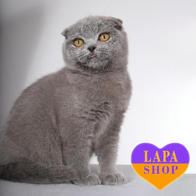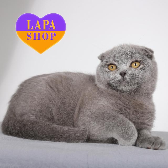 Shany — грациозная кошечка шотландской породы с бархатной голубой шерстью и милыми складочками на ушках.