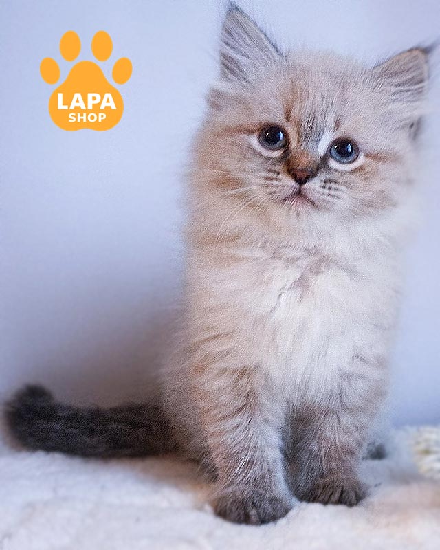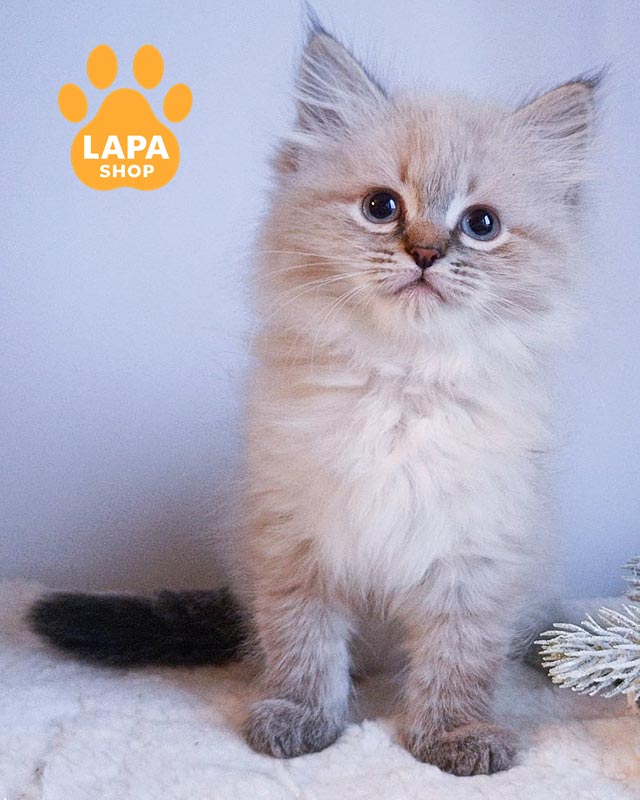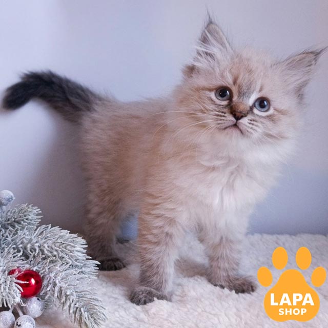 Эта сибирская девочка в нежном сил табби поинт окрасе имеет изящный контраст кремовой шерсти и акцентных темных меток.