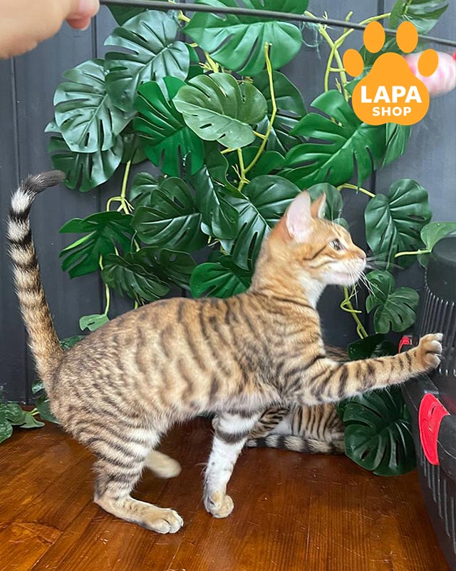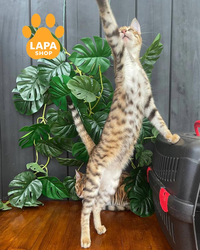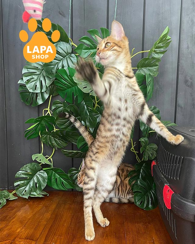 Jumbalaya – яркая тигрица с харизмой в каждом движении. Эта грациозная девочка породы тойгер очаровывает насыщенным тигровым окрасом и выразительным рисунком, что подчеркивает ее экзотическую внешность.