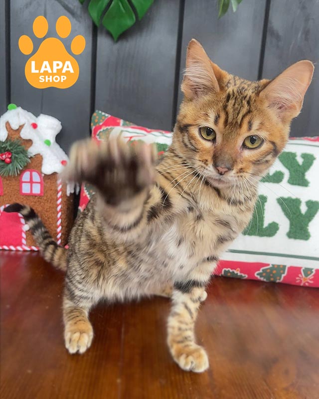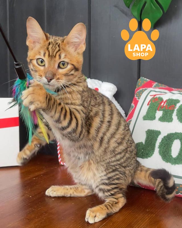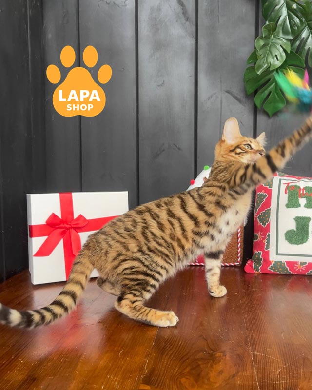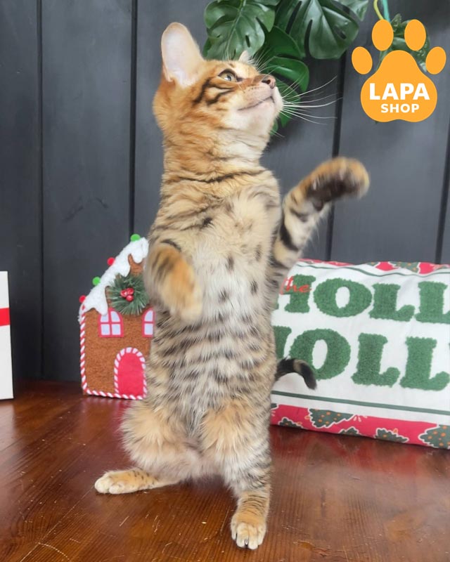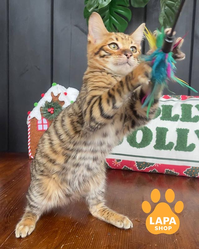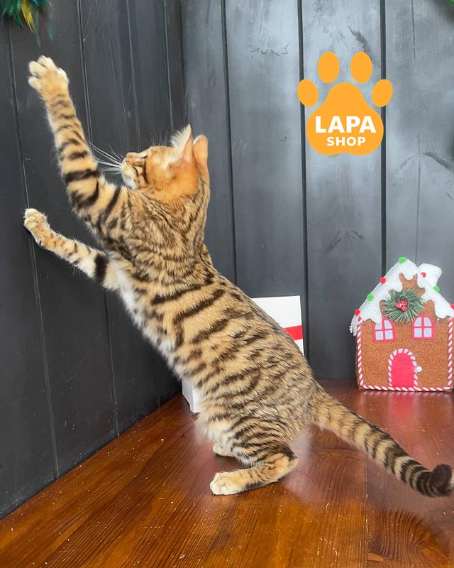 Нептун — мальчик породы тойгер с короткой, блестящей шерстью и выразительной коричневой тигровой окраской, что делает его похожим на маленького дикого кота.