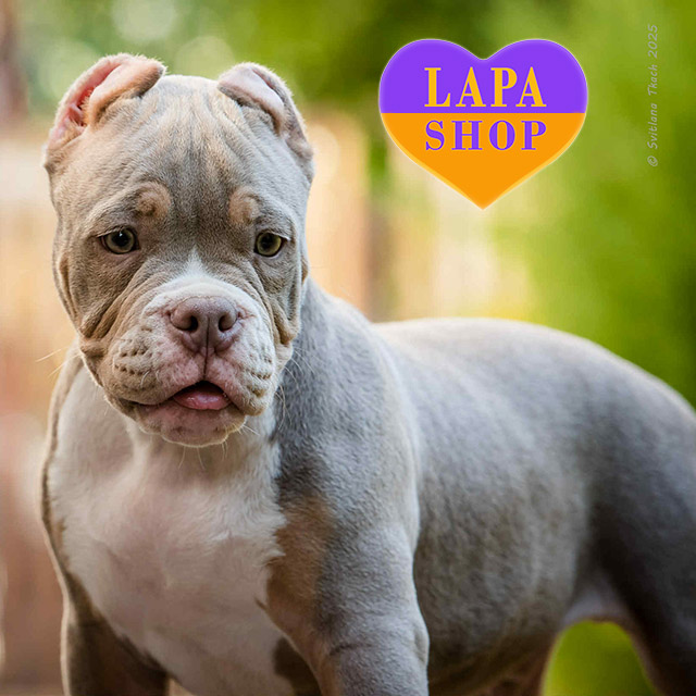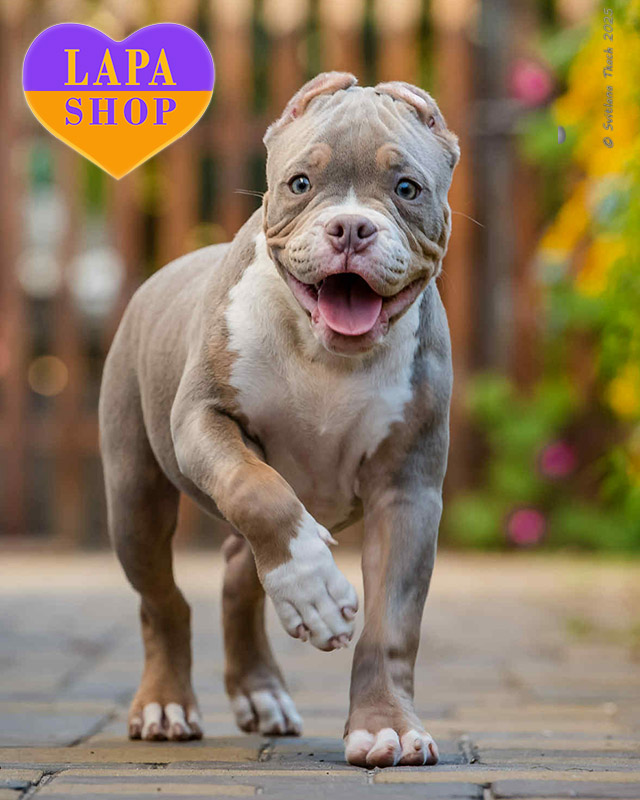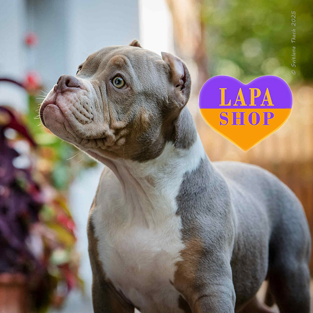 Lucas — мальчик породы американский булли покет, поражающим своим редким лиловым триколоррным окрасом, который выглядит очень ярко и выразительно. Его крепкое и гармоничное телосложение подчеркивает породную красоту и силу.