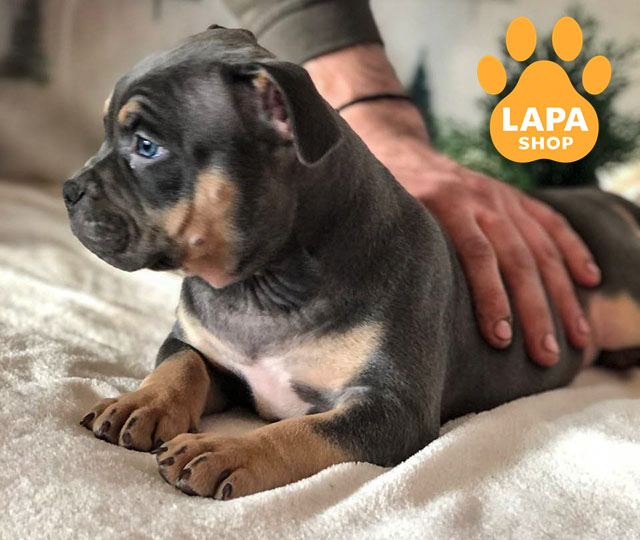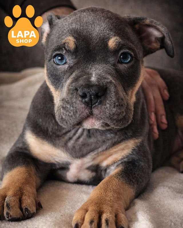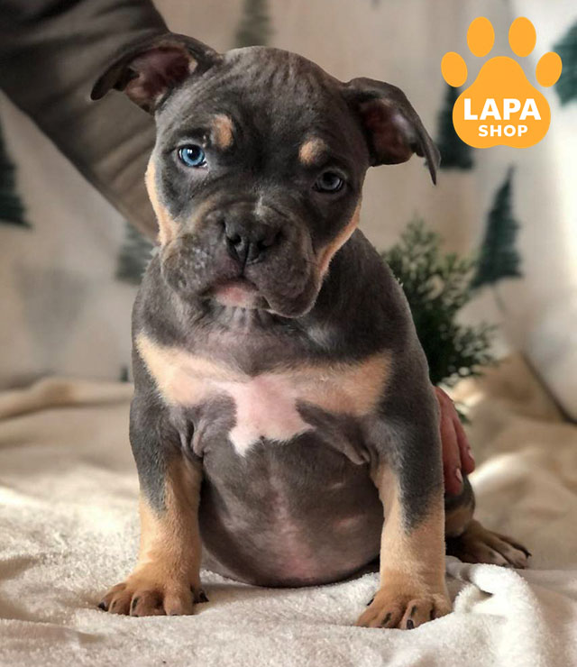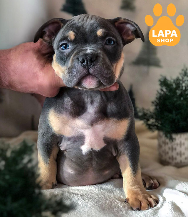 Очаровательная девочка американского булли стандартного типа с ярким голубым триколором. Ее гармоническое телосложение и яркая расцветка подчеркивают породные особенности.