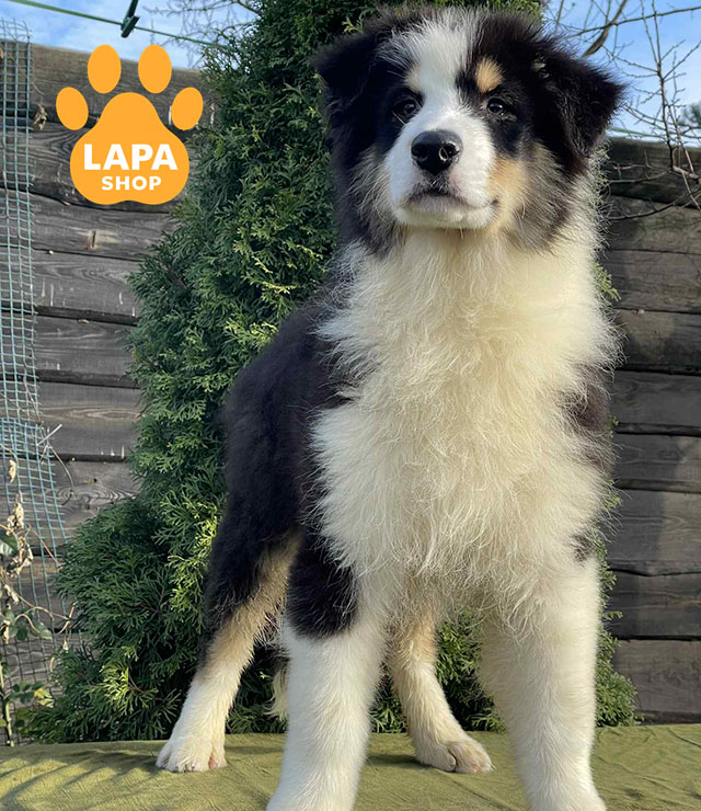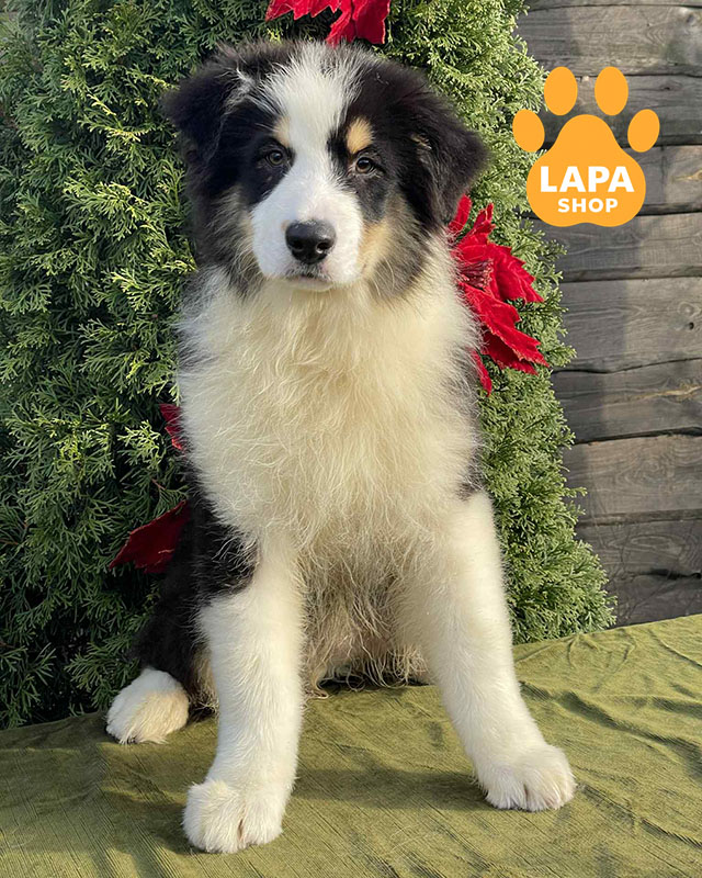 Мальчик австралийской овчарки с ярким черным триколорным окрасом. Утонченное телосложение и гармонические черты делают его настоящим представителем породы. Щенок имеет выразительный взгляд и прекрасно подчеркивает красоту породы.
