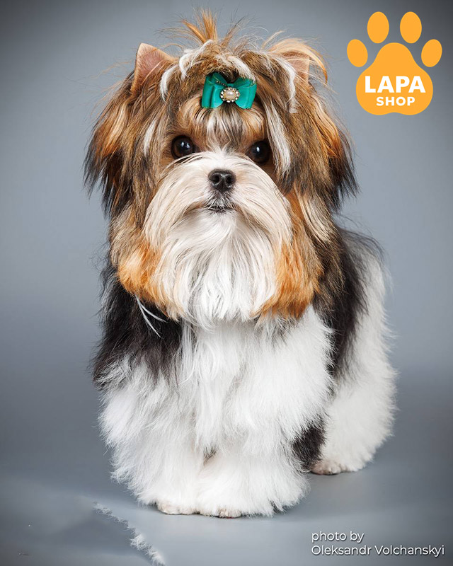 Этот мини-мальчик породы бивер-йоркширский терьер имеет гармоничную трехцветную окраску: черный, белый и золотой. Его миниатюрный размер и элегантная шерсть делают его невероятно милым и привлекательным.