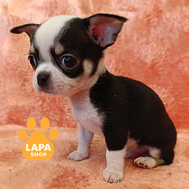 Айрус – стильный гладкошерстный мальчик чихуахуа с контрастным черном с белым окрасом. Его аккуратные формы и выразительный вид делают его привлекательным маленьким другом для любой семьи.