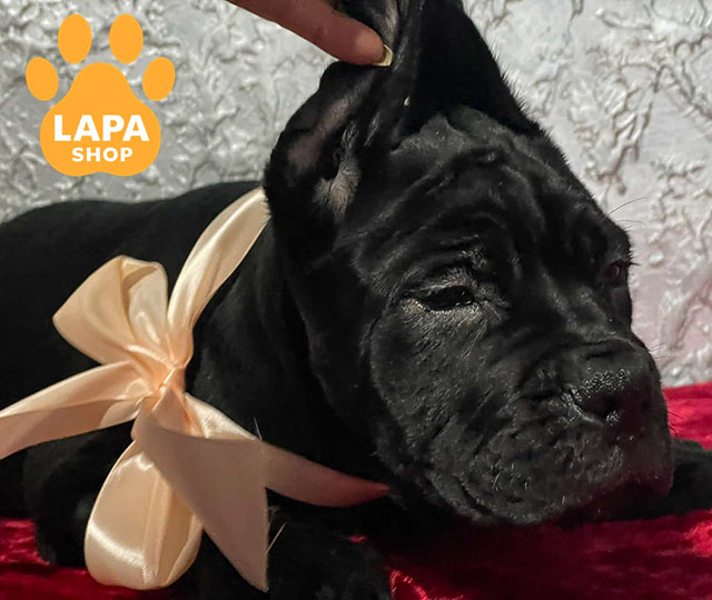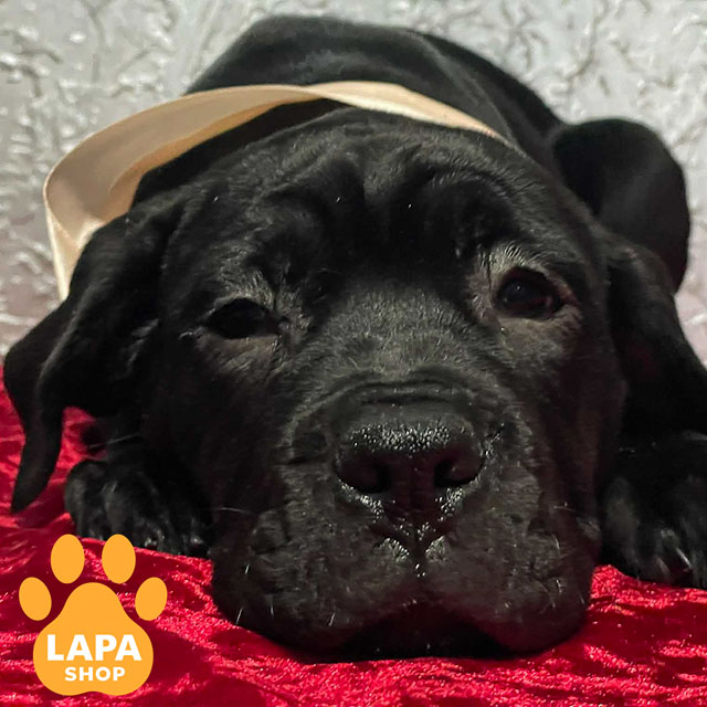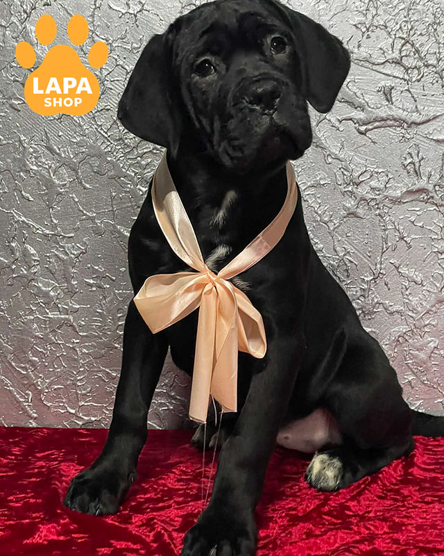 Стильная девочка породы кане корсо в глубоком черном окрасе, который выгодно подчеркивает ее крепкое телосложение и благородный силуэт. Гармонические пропорции тела, сильный скелет и уверенная осанка создают яркий породный образ.