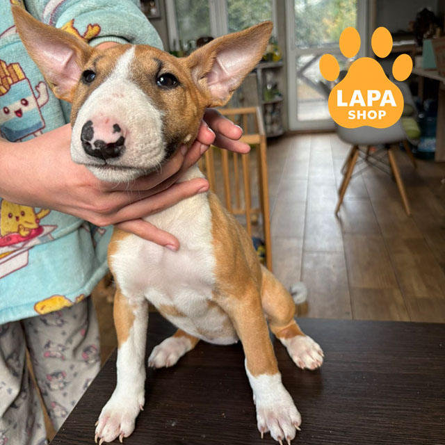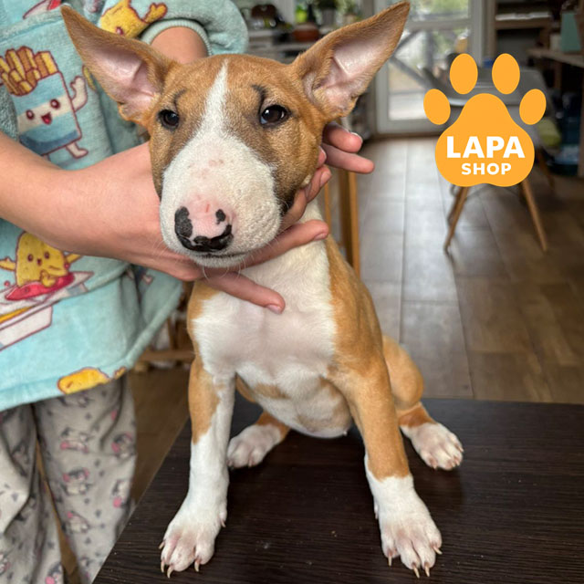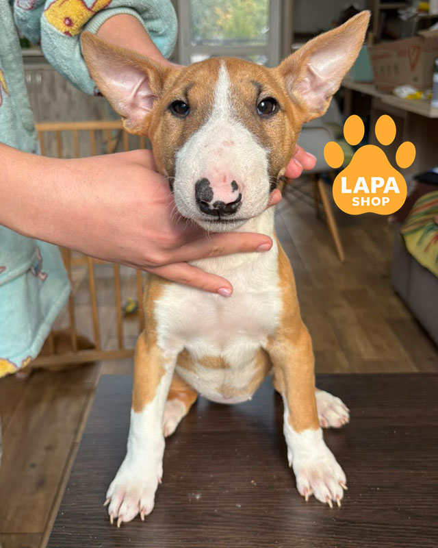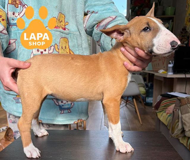 Эта миниатюрная девочка породы миниатюрный бультерьер имеет яркуй бело-рыжий окрас и гармоничные пропорции тела. Ее энергичный вид и блестящий мех подчеркивают породную красоту. Активный и упорный характер делает его особенным и жизнерадостным.