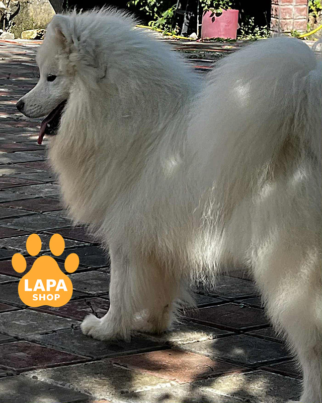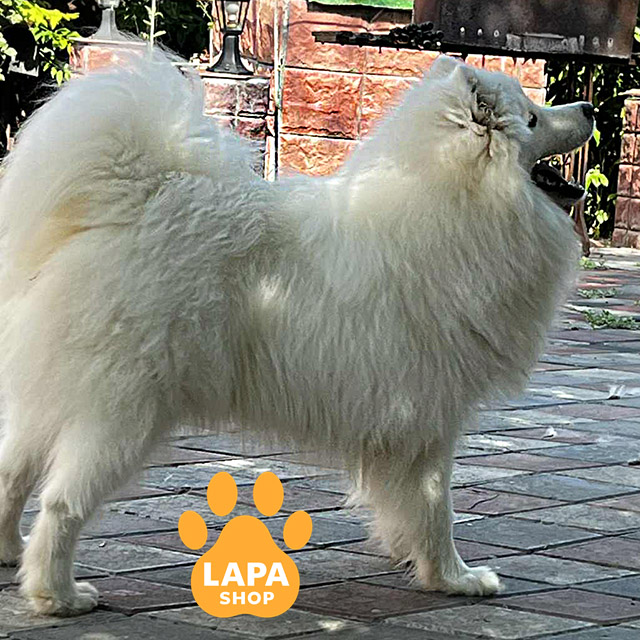 Этот очаровательный мальчик породы самоед с белой пушиной шерстью и выразительными глазами. Он происходит от титулованных родителей и имеет отличную родословную.
