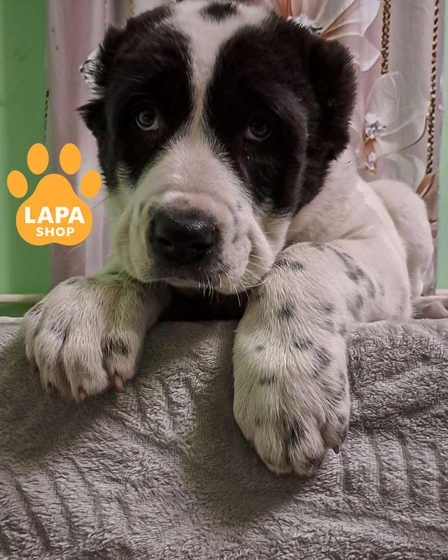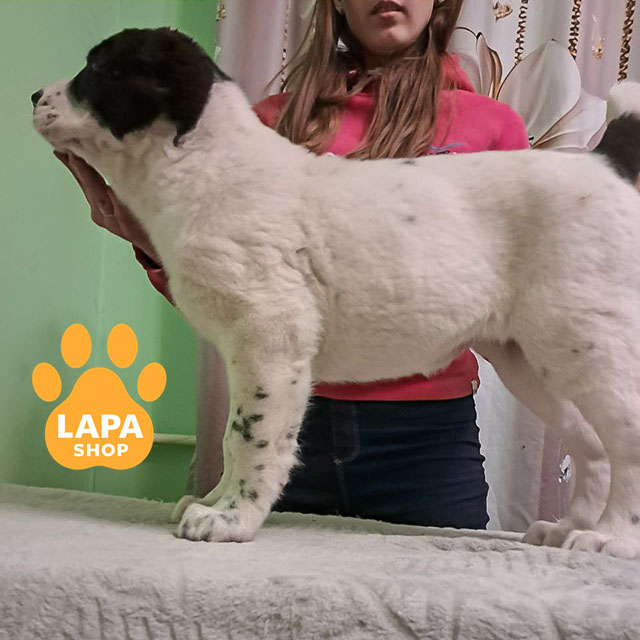 Девочка породы среднеазиатская овчарка имеет поразительный бело-черный окрас, что придает ей элегантность и выразительность. Ее крепкая конституция и мощный скелет подчеркивают породную силу и гармонию. Она выглядит величественно и поражает внешним видом даже с первого взгляда.