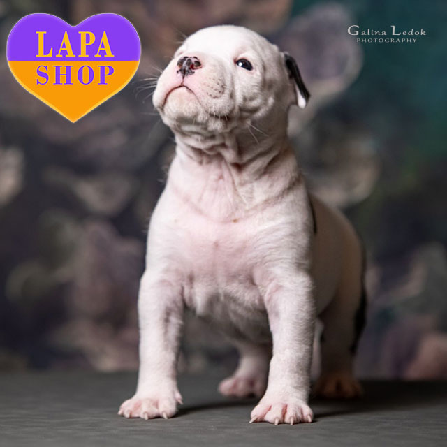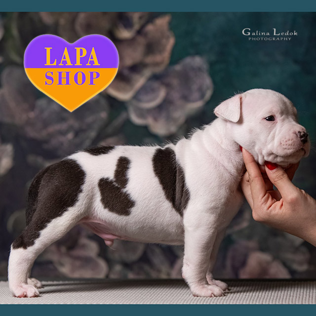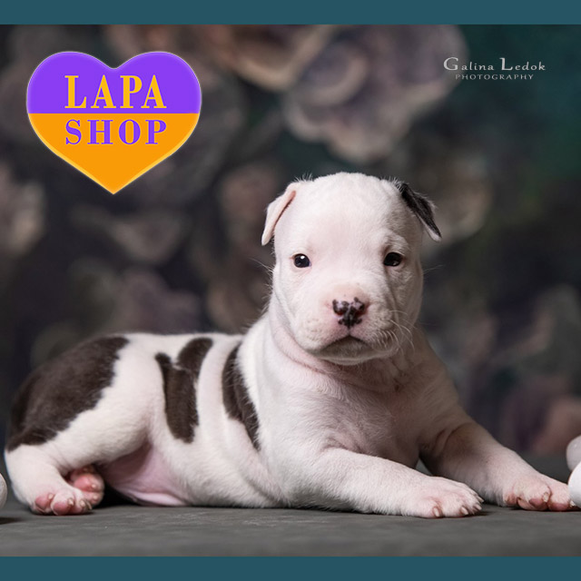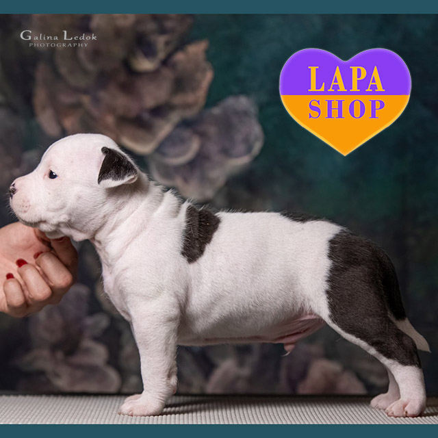 Этот замечательный представитель породы американский стаффордширский терьер с поразительной черно-белой окраской. Его сильное телосложение и уверенный вид подчеркивают характер этой породы. Это настоящий красавец, который станет идеальным другом для вашей семьи.