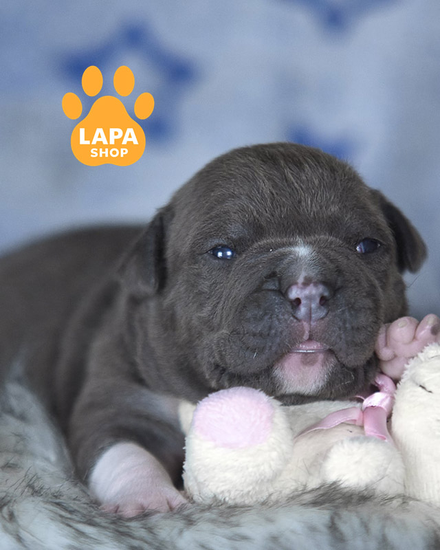 Navy Blue Lily – элегантная девочка породы американский стаффордширский терьер с гармоничным голубовато-белым окрасом. Ее внешность сочетает силу и утонченность, что придает ей особый шарм. Она имеет отличную родословную и происходит от проверенных здоровых родителей.