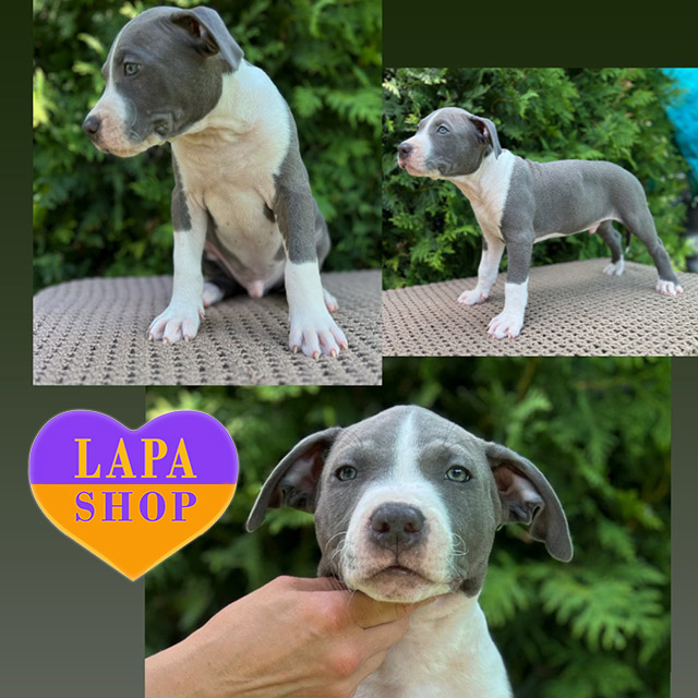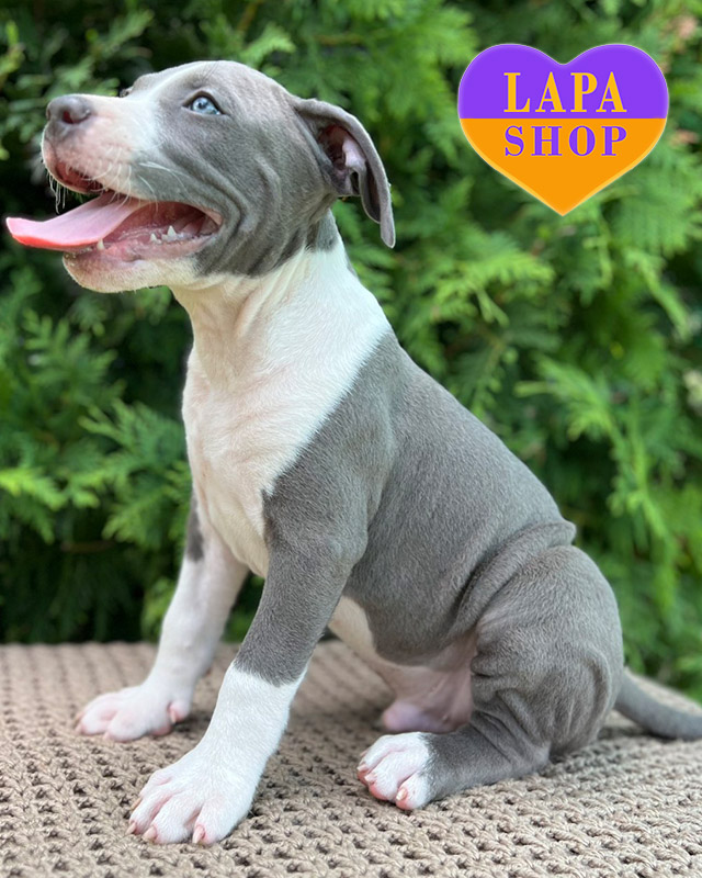Этот красивый мальчик породы американский стаффордширский терьер с изысканным голубым окрасом в сочетании с белыми отметками. Его внешность отличается гармонией силы и элегантности, что делает его особенным среди щенков.