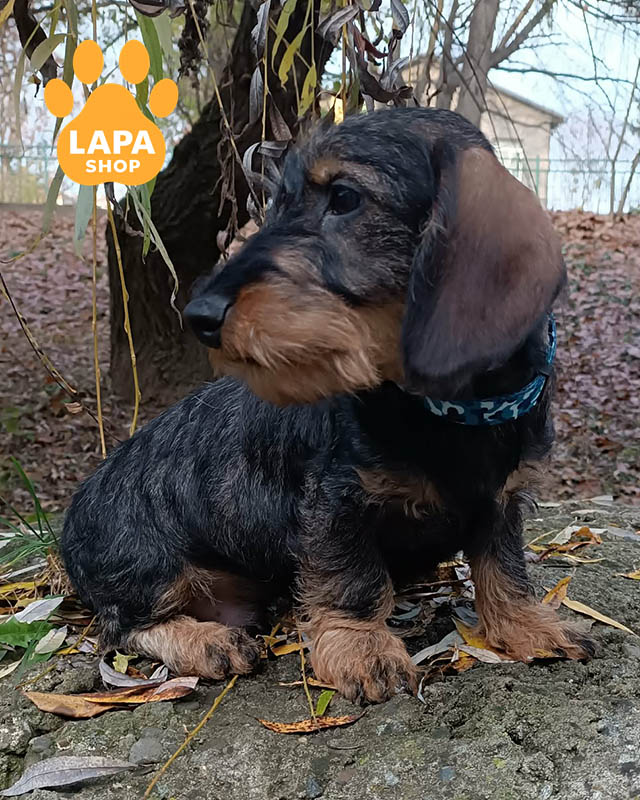 Изысканный мальчик породы такса стандартная жестошерстная из окраса wild boar. Его благородный вид и плотная текстурная шерсть придают ему особый шарм.