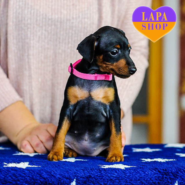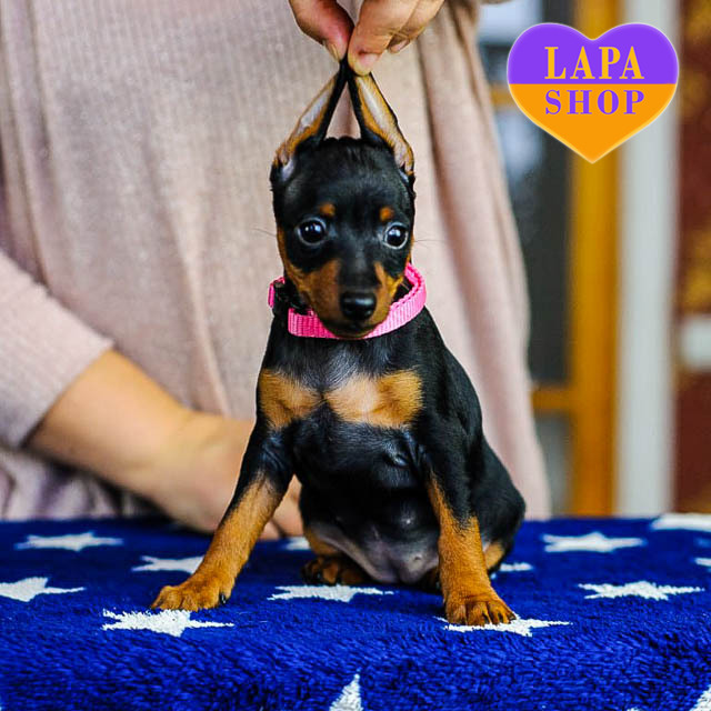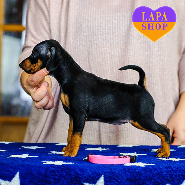 Эта грациозная девочка породы цвергпинчер с черно-подпалой окраской уже готова покорить сердца новых владельцев. Ее изящный вид и яркий характер создают неповторимый образ. Она происходит от отличных родителей с отличными показателями здоровья, что делает ее идеальным выбором для семьи.