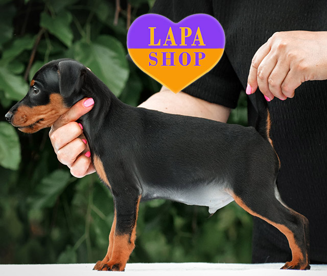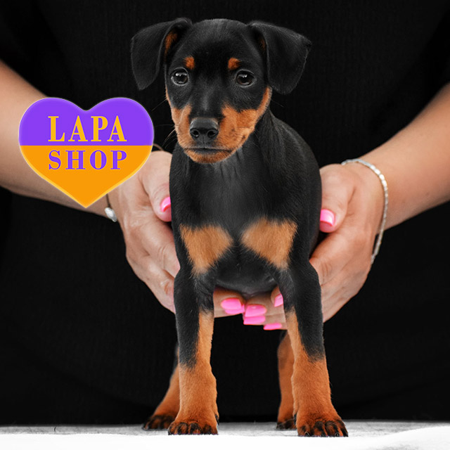Iке – очаровательный мальчик породы цвергпинчер с классическоим окрасом black and tan. Имеет четко очерченное телосложение, блестящую короткую шерсть и уверенное выражение мордашки.