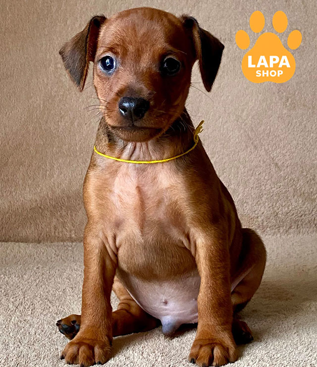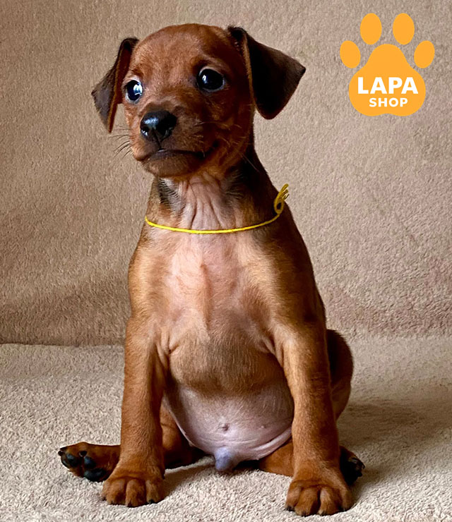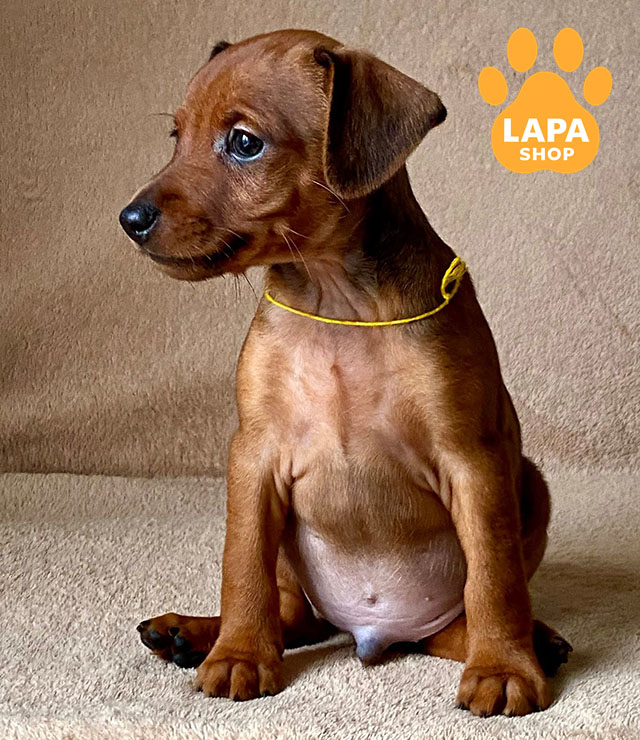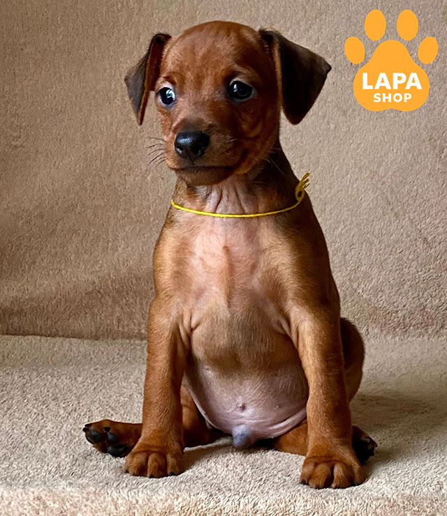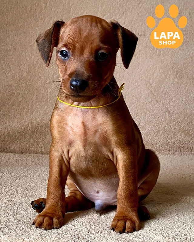 Мальчик породы миниатюрный пинчер поражает насыщенным рыжим окрасом и компактным телосложением. Его пропорциональное тело и блестящая шерсть подчеркивают породные черты, делая его очень привлекательным щенком. Vigor выглядит элегантно и ухоженно, что делает его отличным компаньоном для семьи.
