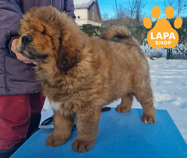 Очаровательный мальчик породы тибетский мастиф с выразительной внешностью и крепким телосложением. Имеет гармонические пропорции и густую шерсть, подчеркивающую породный тип.