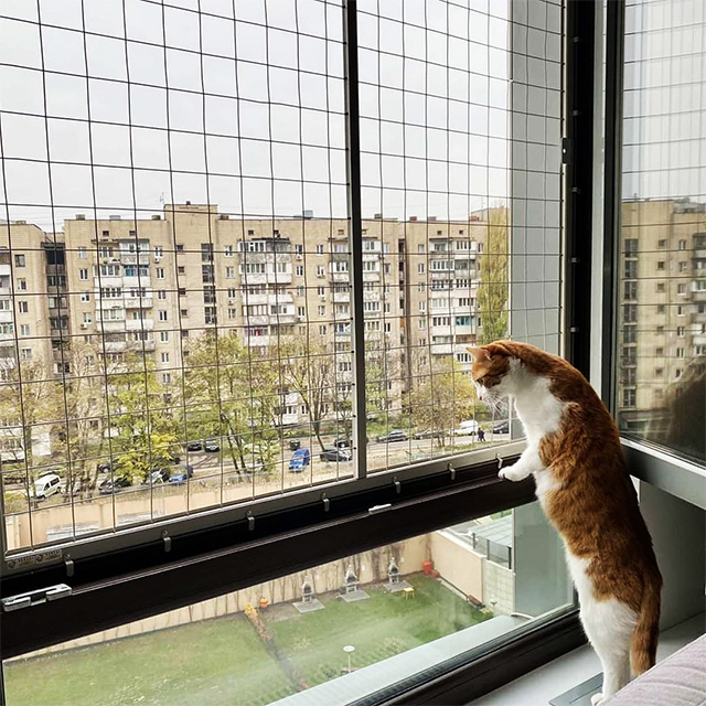 Этот вариант антикошки подходит тем владельцам, которые не боятся, что в окно залетят насекомые. Или, может, вы даже хотите этого, например, если у вас в доме хищные растения, питающиеся насекомыми. Антимоскитных свойств у решетки нет из-за крупных ячеек. Но все остальные функции сохранены: защита кота от падения и возможность лазать по решетке вверх.