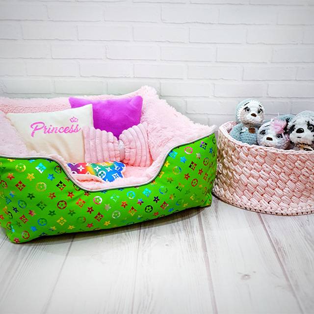 Лежанка комплектуется декоративными подушками и игрушкой.