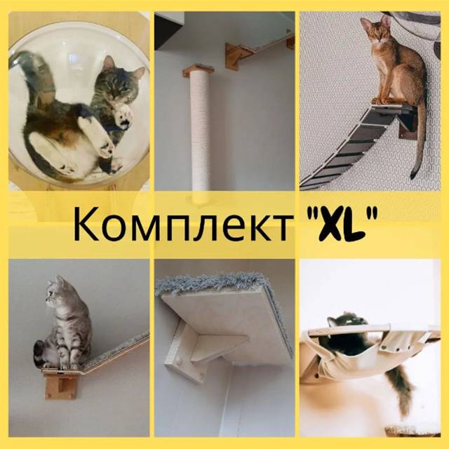 Это увеличенный настенный комплект для кошек, который включает в себя лежанку-гамак, лежанку-сферу, вертикальную настенную когтеточку, 2 полочки, мостик и ковролиновую дорожку. Это целый развлекательный комплекс с местами для отдыха на любой вкус. Комплекта хватает на 4-5 котиков.