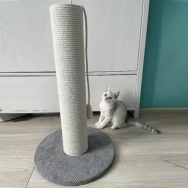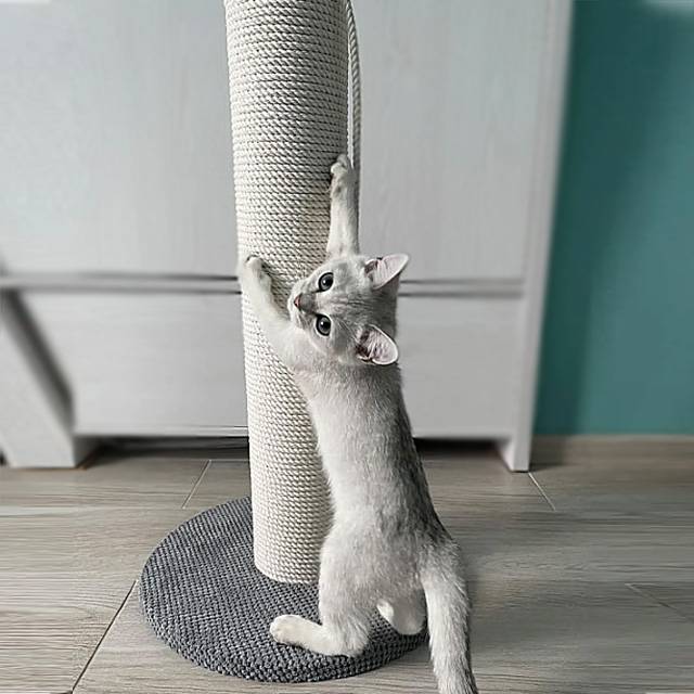 Дуже стильна дряпка висотою на ваш вибір. Конструкція, що добре стоїть і не хитається. Котик може навіть залізти наверх — вона витримає. Білий канат із бавовни прослужить довше, ніж звичайний джутовий або сизалевий. Ідеальний варіант для котів, які люблять точити кігтики на вертикальній поверхні.