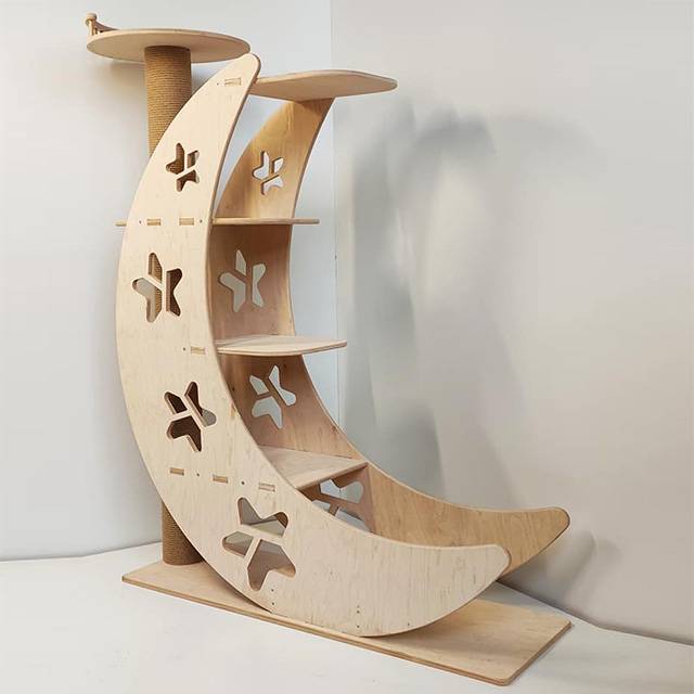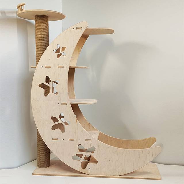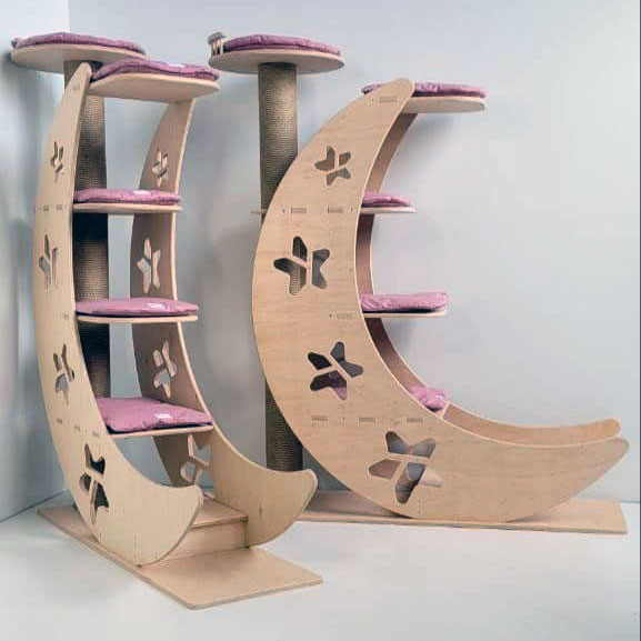 Цей неймовірний комплекс включає в себе 5 спальних місць-поличок, знизу відділ для іграшок або інших дрібних речей і дряпку. Комплекс не займає багато місця на підлозі, акцент зроблений на полички вгору. Подушки можна замовити додатково — на липучках, зав’язках чи резинках. Виріб виготовлений з високоякісної міцної фанери на основі деревини, яка пропитана екологічним лаком на водній основі.