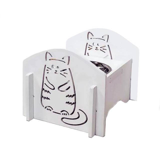 Металева миска в корпусі з високоякісної фанери. Збоку малюнок котика. Їсти з глибокої металевої миски зручно тим котикам, які находяться на промисловому сухому кормі.