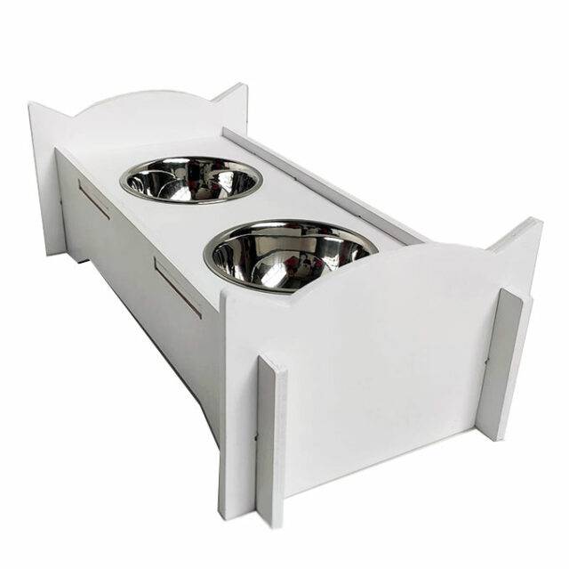 Годівниця вироблена з фанери і має 2 металеві миски для різних видів їжі або для корму та води.
