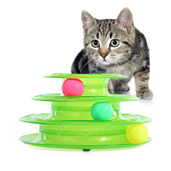 Трек для кішок представлений у вигляді трирівневої конструкції, на кожному рівні якої можна розташувати по одному або кілька м’ячиків, в залежності від вподобань вашої кішки. Яскраві м’ячики катаються по колу, привертаючи увагу та стимулюючи кота до гри.