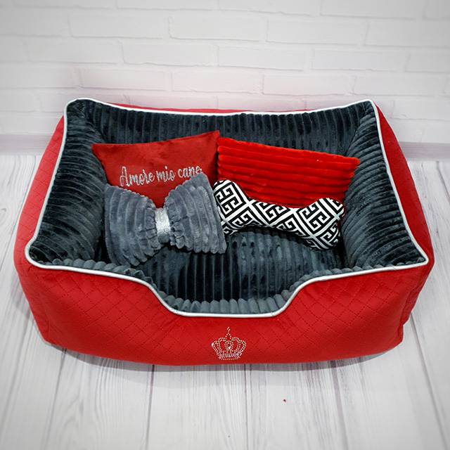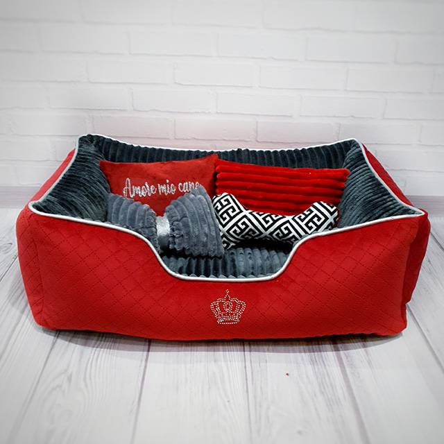 Ця лежанка — ідеальний вибір для вашого улюбленця, де він може відпочивати з комфортом. Великий розмір виробу забезпечує комфортне лежання як для мініатюрних, так і для середніх порід до 8 кг. Ця лежанка виконана з меблевого велюру з перфорацією в формі ромбів та доповнена вельветом сірого кольору. В комплекті йдуть 3 декоративні подушки та іграшка з пищалкою. Логотип на лежанці, прикрашений глітером та стразами, надає їй елегантного вигляду.
