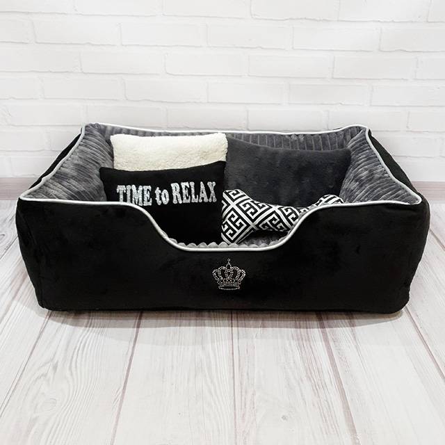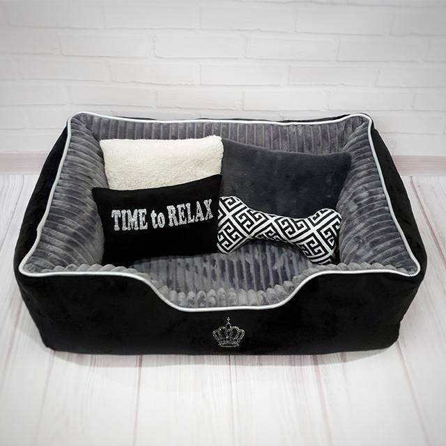 М’яка меблева тканина велюр поєднується з м’яким плюшем сірого кольору. Таке поєднання кольорів виглядає дуже по-багатому і стильно. Кант з екошкіри срібного кольору прикрашає цю лежанку, додаючи їй вишуканості та елегантності. Яскравий логотип з глітером та стразами робить її особливою, а декоративні подушки та іграшка з пищалкою створюють атмосферу гри та радості.