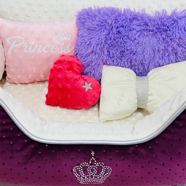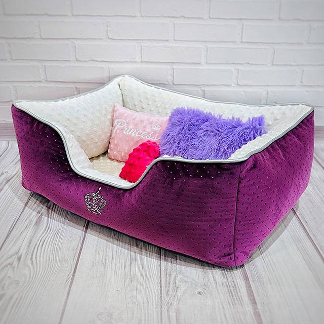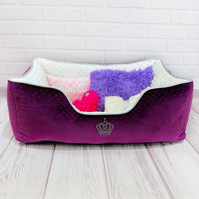 Лежанка для собак — ідеальне місце для вашого пухнастого друга. Рекомендовано для домашніх улюбленців вагою до 6 кг. Вологостійке дно забезпечує довговічність і чистоту лежанки. В комплекті 3 декоративні подушки і м’яка іграшка. Стильний логотип із блиском і стразами додає вишуканості.
