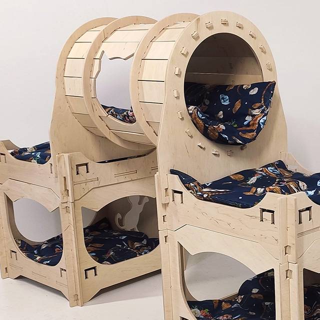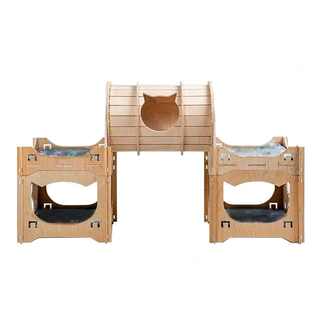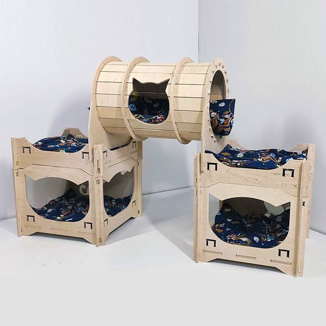 Це цілий розважальний комплекс для ваших котів, складений із 3 окремих модулів. Два будинчка мають всередині лежанку і поєднуються між собою містком-тунелем. Всередині тунеля теж знаходиться лежанка. Одночасно в комплексі може перебувати троє дорослих котиків.