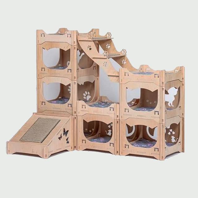 Комплекс має 3 башні, поєднані між собою містком, та дряпку. Одночасно тут можуть відпочивати 10 котів.