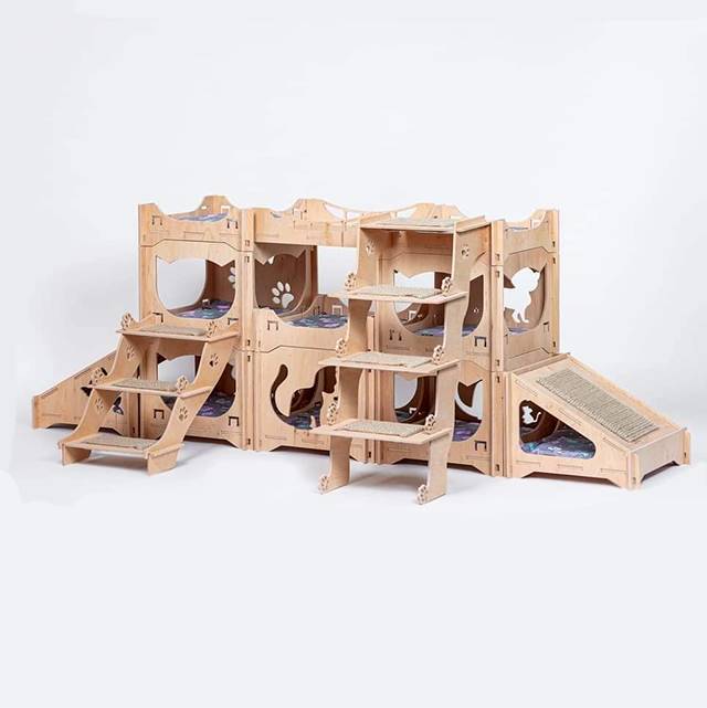 Комплекс складається з 7 окремих модулів, а також двох дряпок під нахилом і двох маленьких сходів із дряпками. На даху розташовані 2 лежанки і лежанка-місток. Модулі із дряпками також мають всередині місця для лежання. Таким чином, комплекс може вмістити мінімум 11 котів.