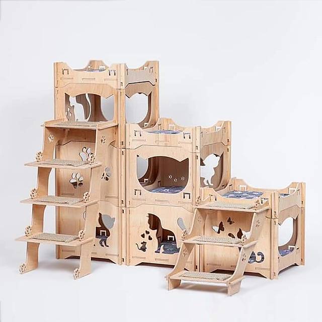 Комплекс складається з 6 окремих модулів і 2 дробин із дряпками, щоб котикам було зручніше по ним пересуватися. На даху розташовані 3 лежанки. Комплекс розрахований мінімум на 9 котів.