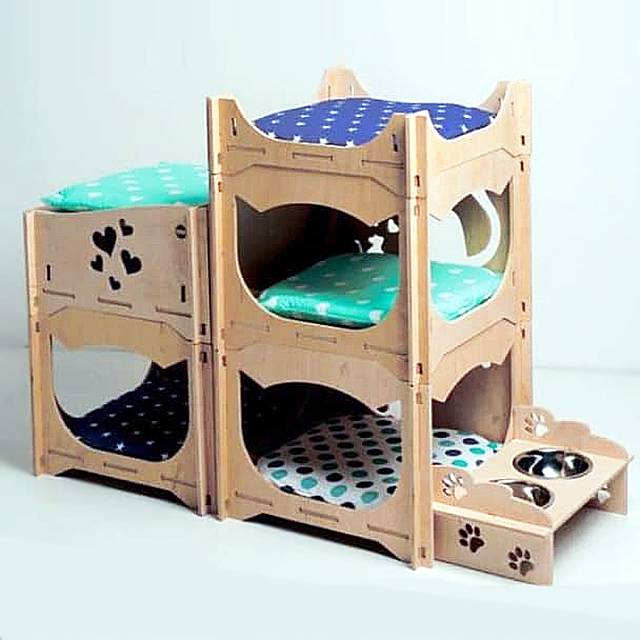 Міні-комплекс включає в себе 4 великих модулі з місцями для лежання, 2 відкриті лежанки. Таким чином, одночасно розмістится в комплексі можуть мінімум 5 котів. Комплекс легко збирається і розбирається на окремі модулі або на більш дрібні частини, щоб його було легко перевозити. Зібрати може навіть людина без досвіду.