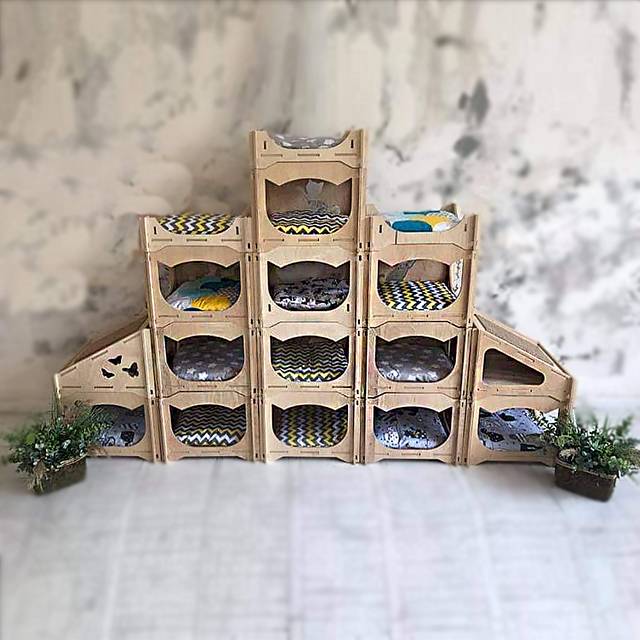 Один із найбільших будинків для котів в нашій колекції. Він складається з 14 окремих модулів, які можна по-різному поєднувати між собою. З цих модулів 2 представляють собою мансарди, на дахах яких розташовані дряпки під нахилом. На верхніх дахах є 3 окремі відкриті лежанки. Таким чином комплекс може помістити в собі 17 котів.