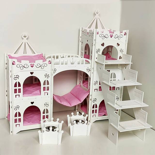 Цей прекрасний казковий комплекс забезпечіть місцями для ігор і відпочинку одразу декілька котіків. Він має 2 башні, поєднані між собою містком і гамаком. На містку теж можна лежати, як і на даху замку. Одна башня має 2 поверхи із лежанками, друга — 3 поверхи. Таким чином одночасно цей замок може вміщувати мінімум 9 котиків.